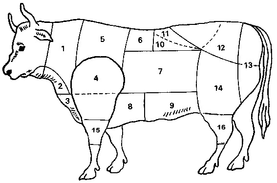 1. Hals (Kamm) 2. Stich (Brustkern) 3. Brust (Vordere) 4. Rindsblatt (Schulter) 5. Zungenstück 6. Hohe Rippe 7. Querrippe (Zwerchrippe) 8. Brust (Mittelstück) 9. Bauch 10. Lende 11. Filet 12. Hüfte 13. Schwanzstück 14. Oberschale 15. Wadschunken 16. Wadschunken