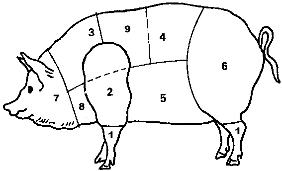 1. Haxe (Eisbein) 2. Schweinsschulter 3. Schopfbraten (Kamm) 4. Kurzes Karree 5. Bauchfleisch 6. Schweinsschlegel 7. Schweinskopf mit Göderl 8. Schweinsbrust mit Schwarte 9. Langes Karree
